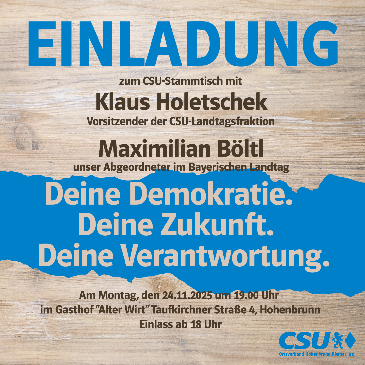 Einladung zum prominent besetzten CSU-Stammtisch mit Klaus Holetschek