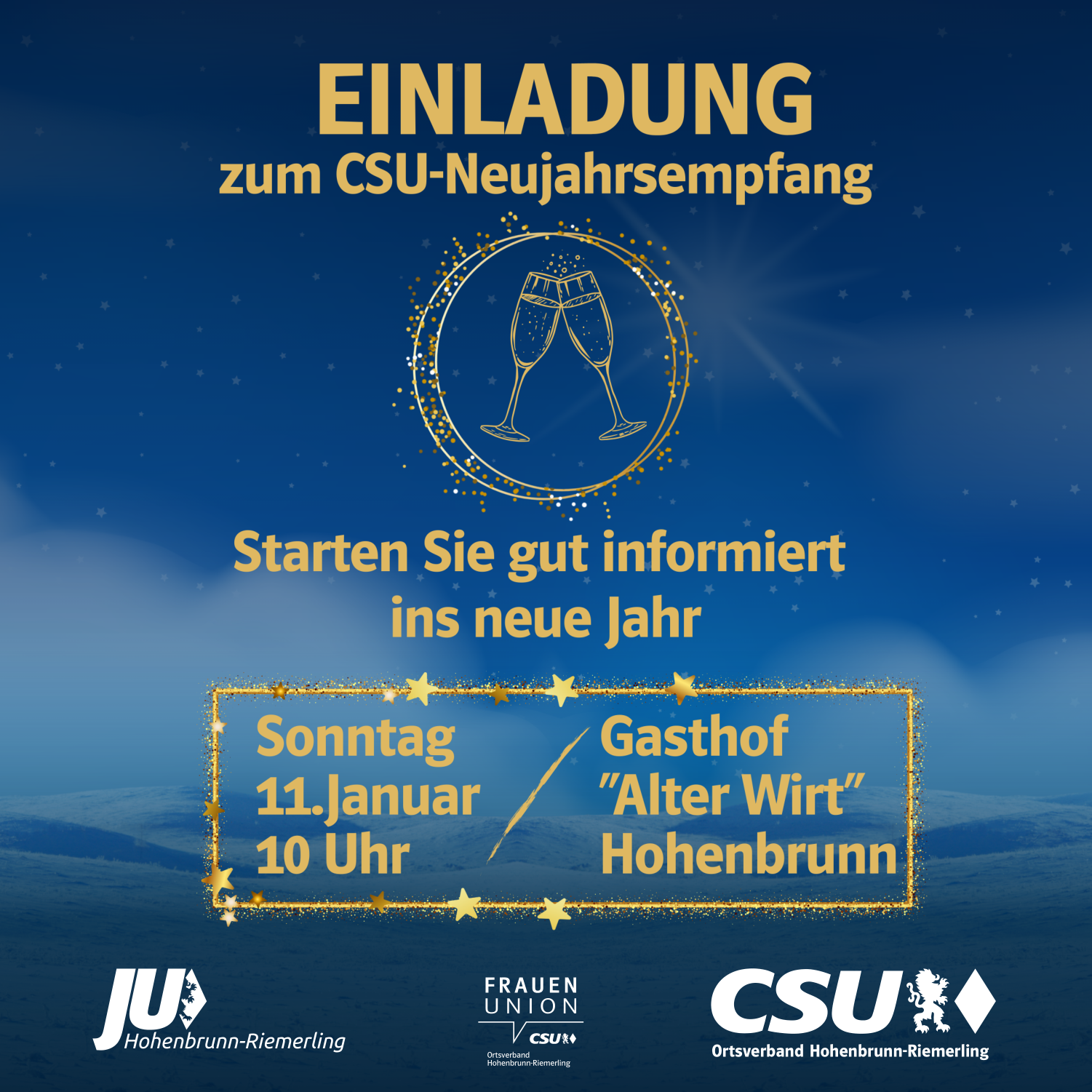 Wir möchten voller Optimismus und Tatkraft gemeinsam mit Ihnen ins neue Jahr starten und laden Sie daher sehr herzlich zu unserem CSU-Neujahrsempfang 2026 am Sonntag, dem 11. Januar 2026 um 10:00 Uhr im Gasthof „Alter Wirt“ in Hohenbrunn ein. [Weiterlesen…]